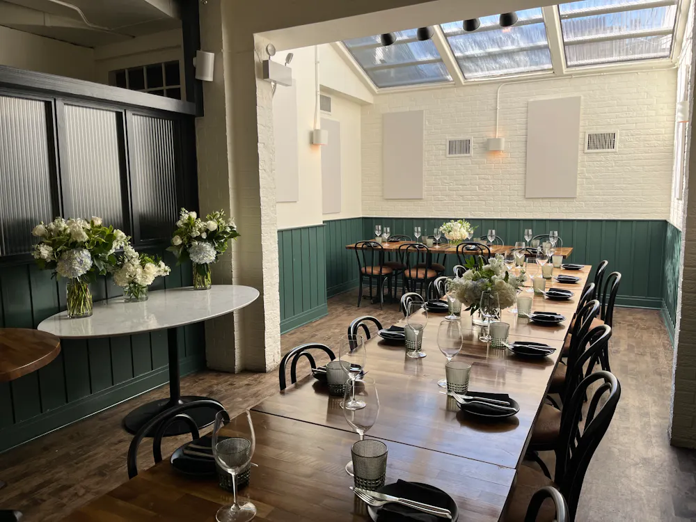 ![]() | Private Dining Room (Up to 24 Guests) Our private dining room is ideal for intimate gatherings of up to 24 guests, including rehearsal dinners, showers, corporate dinners, and celebrations with family and friends. Private dining events feature a custom, seasonal menu, with optional wine pairings and cocktail selections curated by our team. Food & beverage minimums apply. To inquire about private dining availability, please complete the Event Inquiry Form, and a member of our team will be in touch. Large Party Reservations (7–10 Guests) For groups of 7–10 guests, we offer large party reservations in our dining room. Large party reservations are not private events and are seated alongside regular service. A food & beverage minimum is required, and guests order from our regular dinner menu. Custom menus are not available for large party reservations. To request a large party reservation, please use the Large Party Request button on our website. Availability is limited. |